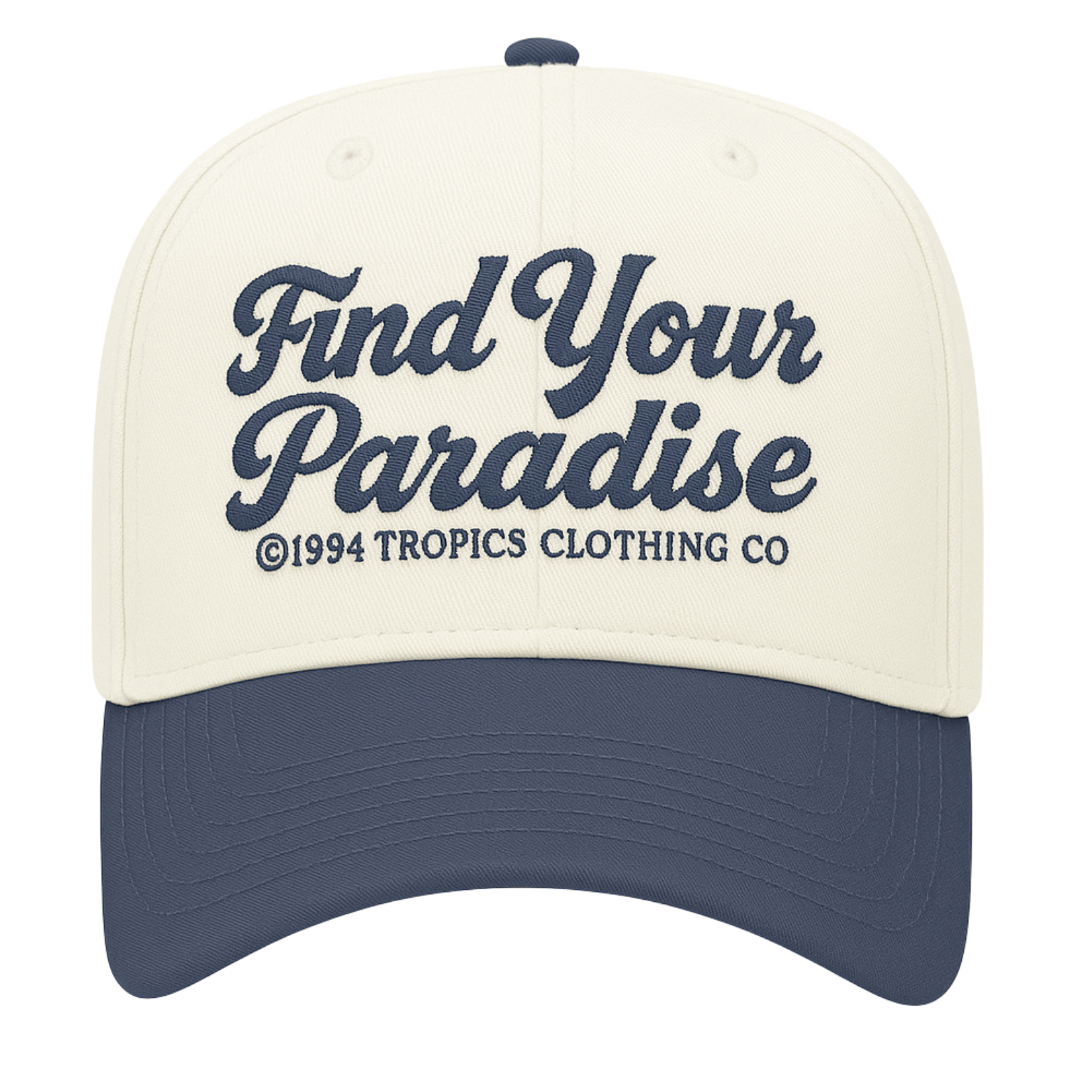 Elevate your everyday style with the Find Your Paradise 5 Panel Hat. Featuring bold embroidery on a clean cream crown, this two-tone five panel cap is built for comfort, attitude, and adventure. The structured front panel offers a premium feel, while the curved brim provides shade and style. Whether you're chasing sunsets or city streets, this hat is your reminder to always seek your paradise.